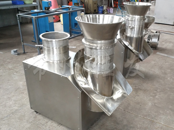 本機是通過一組旋轉碾刀,將前道工序制成的濕材注入環(huán)碾刀的不銹鋼篩筒篩孔中,從而制成圓柱狀的濕顆粒,供下道工序拋丸使用。本設備可通過更換不銹鋼篩筒來取得不同大小的顆粒。